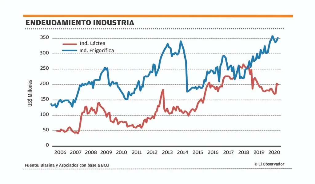 Según los datos del BCU, el monto promedio mensual de créditos a la industria frigorífica en la primera mitad de 2020 fue de US$ 338 millones, un aumento de 18% frente a los US$ 287 millones de igual período del año anterior. El porcentaje de créditos vencidos sobre el total fue de 4,3% contra el 0,46% del primer semestre de 2019.