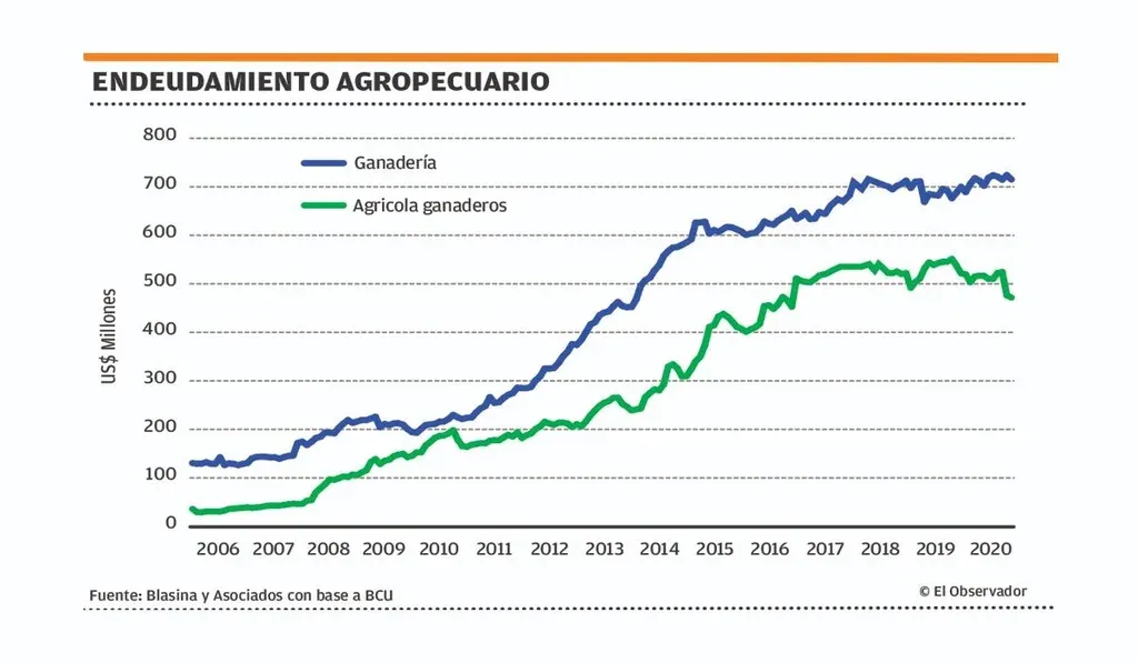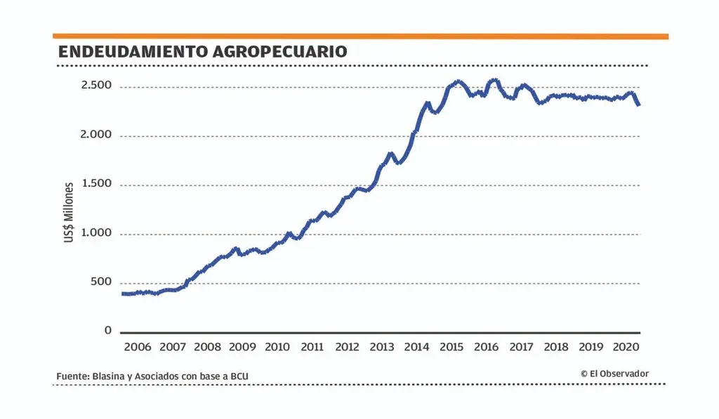 En las explotaciones agrícolas ganaderas la deuda total con el sistema bancario pasó de US$ 520 millones a US$ 472 millones en un año, una caída de 12%. El porcentaje de créditos vencidos sobre el total fue de 4%, contra el 3% de un año atrás.