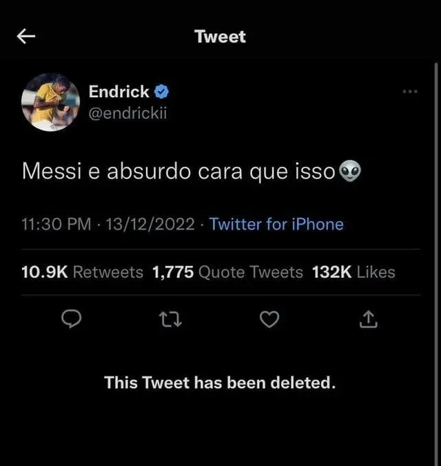 El flamante fichaje de Real Madrid, el brasileño Endrick de 16 años, elogió a Lionel Messi por su actuación en el partido contra Croacia, por las semifinales del Mundial de Qatar 2022, pero tuvo que borrar su posteo de las redes sociales al recibir muchas críticas de parte de hinchas de los merengues.