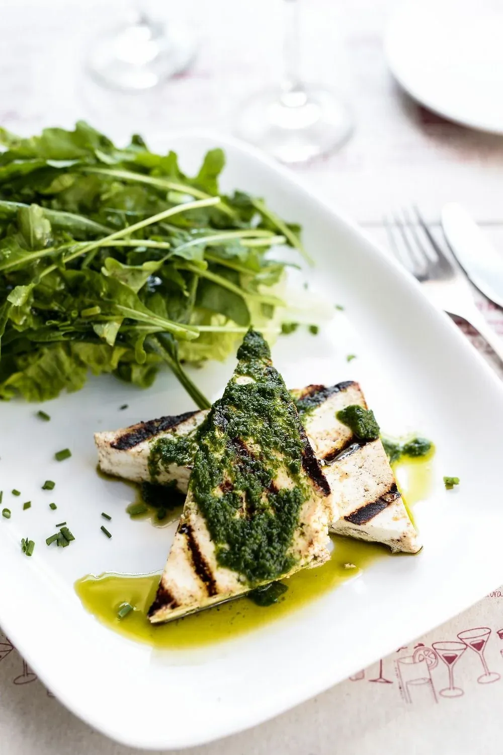 La ensalada es constante en sabor y presentación. Las hojas verdes (lechuga y rúcula) son seleccionados cuidadosamente y presentadas con arte; los dos triángulos de ricota están saborizados con sal, pimienta y un secreto muy bien custodiado. La ricota está sellada a la plancha y cubierta con un aderezo de rúcula que le aporta más suntuosidad.