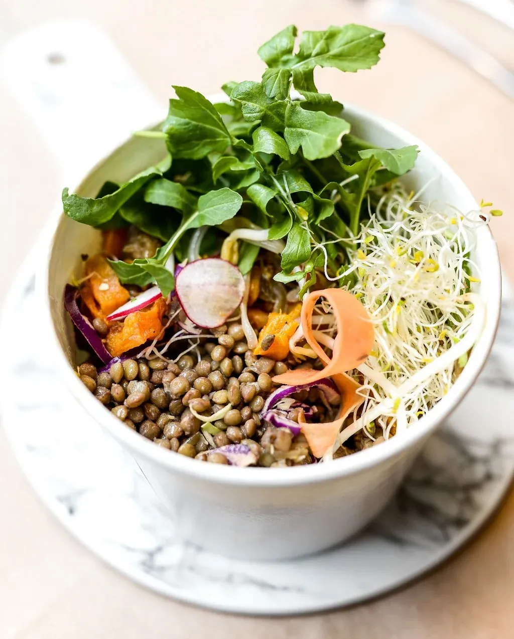 La ensalada de lentejas tiene tiene repollo (morado y blanco), zanahoria en láminas, brotes de soja, calabacín asado al horno, semillas de girasol, cebolla caramelizada y abundantes lentejas. El aderezo es de mostaza, miel, con gotas de limón y aceite de oliva virgen. Es una de las más originales del mercado montevideano y es suculenta, nutritiva y apetitosa. Tiene balance de texturas y una ligazón perfecta. La cebolla caramelizada y la vinagreta le aportan elegancia.