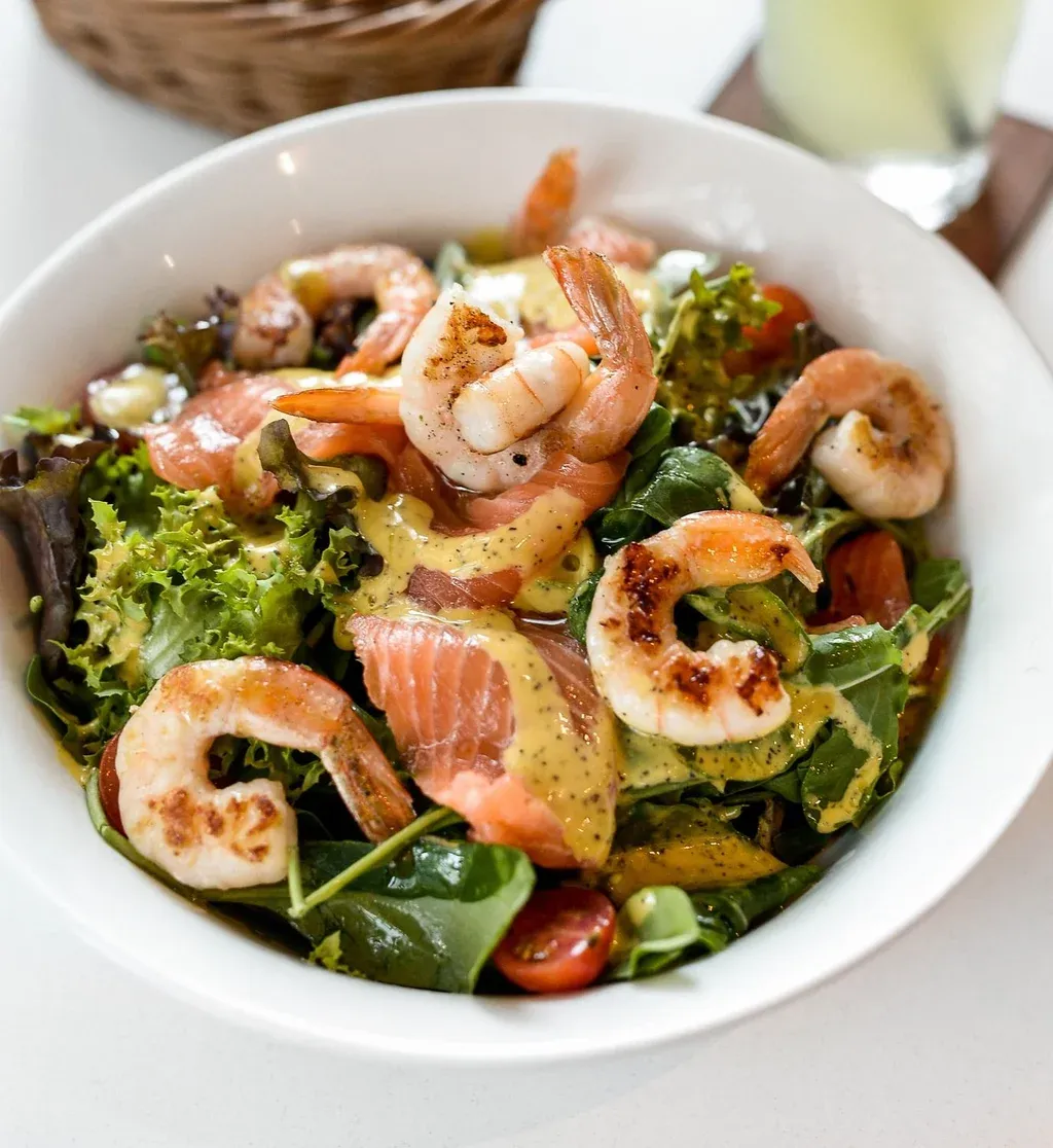 El salmón premium es fresco y está cortado al estilo sashimi para sentir su carnosidad. Los langostinos medianos están pelados y grillados y el maracuyá envuelve todo. "Va muy bien con el salmón, es original, bien fresco y, al mismo tiempo tiene amargor y dulzor". Además, tiene cherries que aportan frescura y color y una importante base de verdes (diversas lechugas y rúcula). Es una propuesta que se destaca por sabor, la presentación —con el brillo del aderezo y armonía colores— y el equilibrio de pocos productos bien definidos.