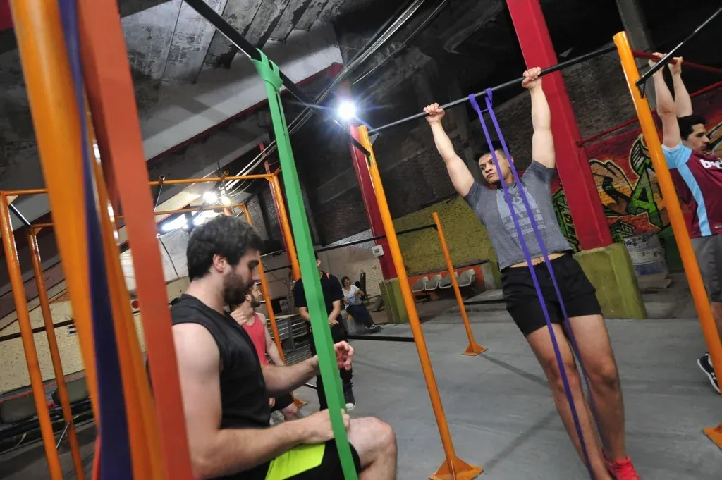 El primer ejercicio consiste en realizar dominadas colgado de una barra. Para estas –considerando que se trata de alguien que recién comienza–, se suelen utilizar bandas que sirven para restarle kilaje al propio cuerpo y facilitar la dominada. Las bandas están colgadas de las barras y se colocan en la planta de los pies.