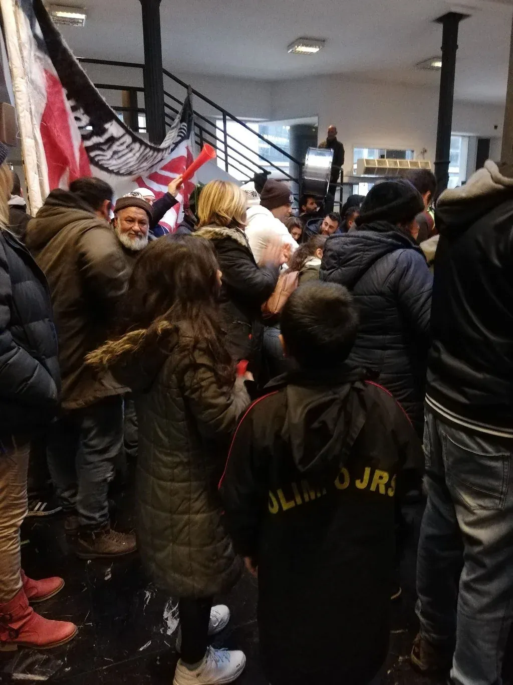 Mientras se daba la votación y la posterior argumentación del voto, el sindicato del taxi volvió a entrar al edificio de la junta y comenzó a caminar alrededor de la sala de sesiones. Al frente iba Pereira, arengando a sus compañeros del gremio, que golpeaban los vidrios y les levantaban el dedo mayor a los representantes. Los gremialistas iban acompañados de niños, que también hacían gestos ofensivos a los ediles.