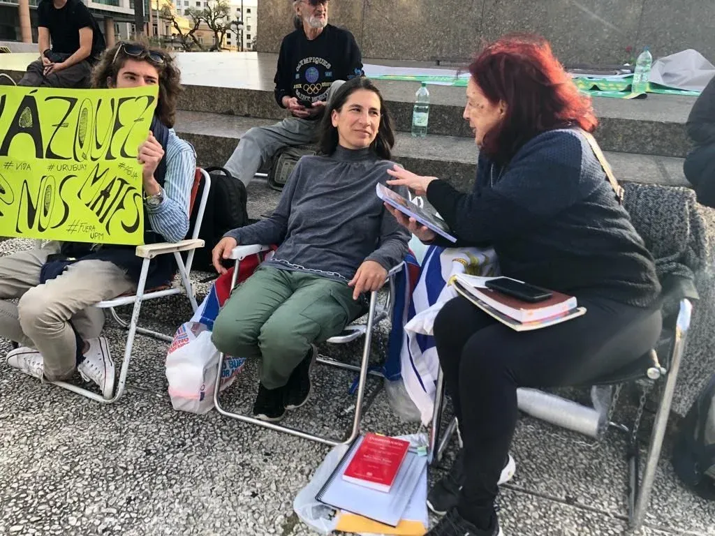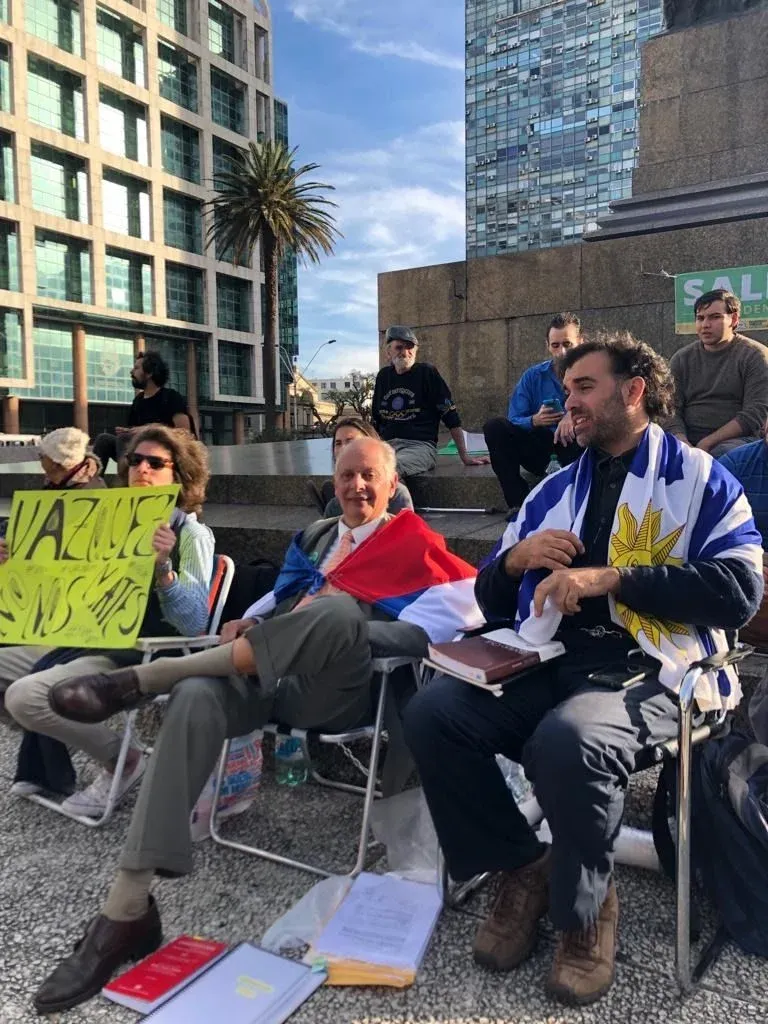 Junto a Marcelo Hospitale, el activista que hace una semana irrumpió en el Ministerio de Transporte para increpar a autoridades del gobierno por el acuerdo con la compañía, los críticos del gobierno se sentaron en un par de sillas de playa frente al monumento del prócer José Artigas. A sus pies, varios libros que llevaron al lugar para expresar que lo que dicen está "amparado por la ley". En frente se podía ver a la Casa de Gobierno vallada.
