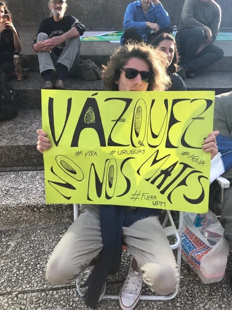 Maite Gallego Vladimir Knazevs, un joven de 18 años que también fue a acompañar la lucha contra UPM, explicó que llegó tarde porque se durmió y que no planeaba quedarse toda la noche. El militante sostenía, al costado de Salle, un cartel que decía: "Vázquez no nos mates". Explicó que mientras hacía el letrero sobre cartulina se puso a pensar en que nadie le consultó a él al momento de que el gobierno firme un nuevo contrato con UPM.