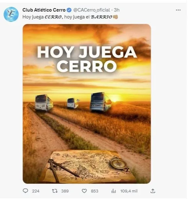 El club de la Villa publicó en su cuenta oficial de Twitter, un tuit que roza la broma y la ofensa: "Hoy juega Cerro, hoy juega el barrio" es el mensaje sobre una foto donde se ven tres ómnibus en medio de un campo y una brújula sobre un mapa, refiriéndose a la ubicación del estadio mirasol.