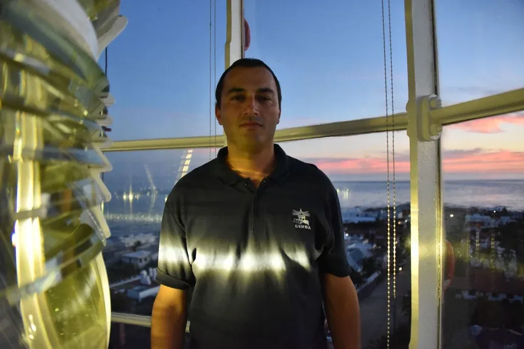 A Álvaro Fajardo le encanta sacar fotos de los atardeceres. Su celular está repleto de imágenes de las puestas de sol. Aunque su favorita la hizo en el mar, en su lugar de trabajo tiene una vista que lo ayuda a hacer esos retratos. Porque Fajardo es el encargado del Faro de Punta del Este, y cada día, cuando el sol se oculta, tiene que subir los 150 escalones que separan la base del fanal y prenderlo.
