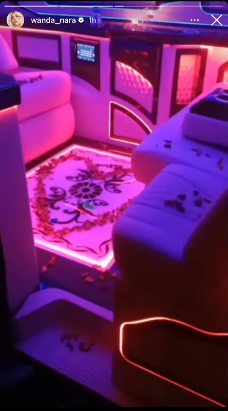 Wanda Nara regresó a Estambul en las últimas horas, donde fue a ver un partido de su exmarido con el Galatasaray. Pero también compartió un video en sus historias de Instagram donde se ve el interior de una camioneta iluminada con luces rosadas y rojas, con el piso y los asientos cubiertos de pétalos de rosas y velas.