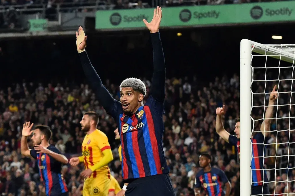 Pau Barrena / AFP Así protestó Araujo Santiago Bueno fue titular en Girona. Estuvo a punto de hacerse un gol en contra pero en el cierre del partido anuló las intentonas de Robert Lewandowski.