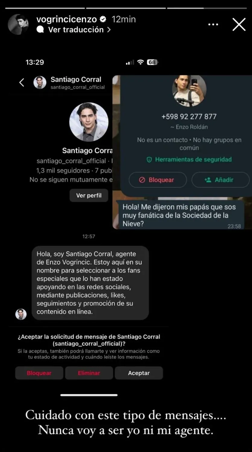 El actor de La sociedad de la nieve denunció en su cuenta de Instagram que hay varios perfiles haciéndose pasar por él o por su representante