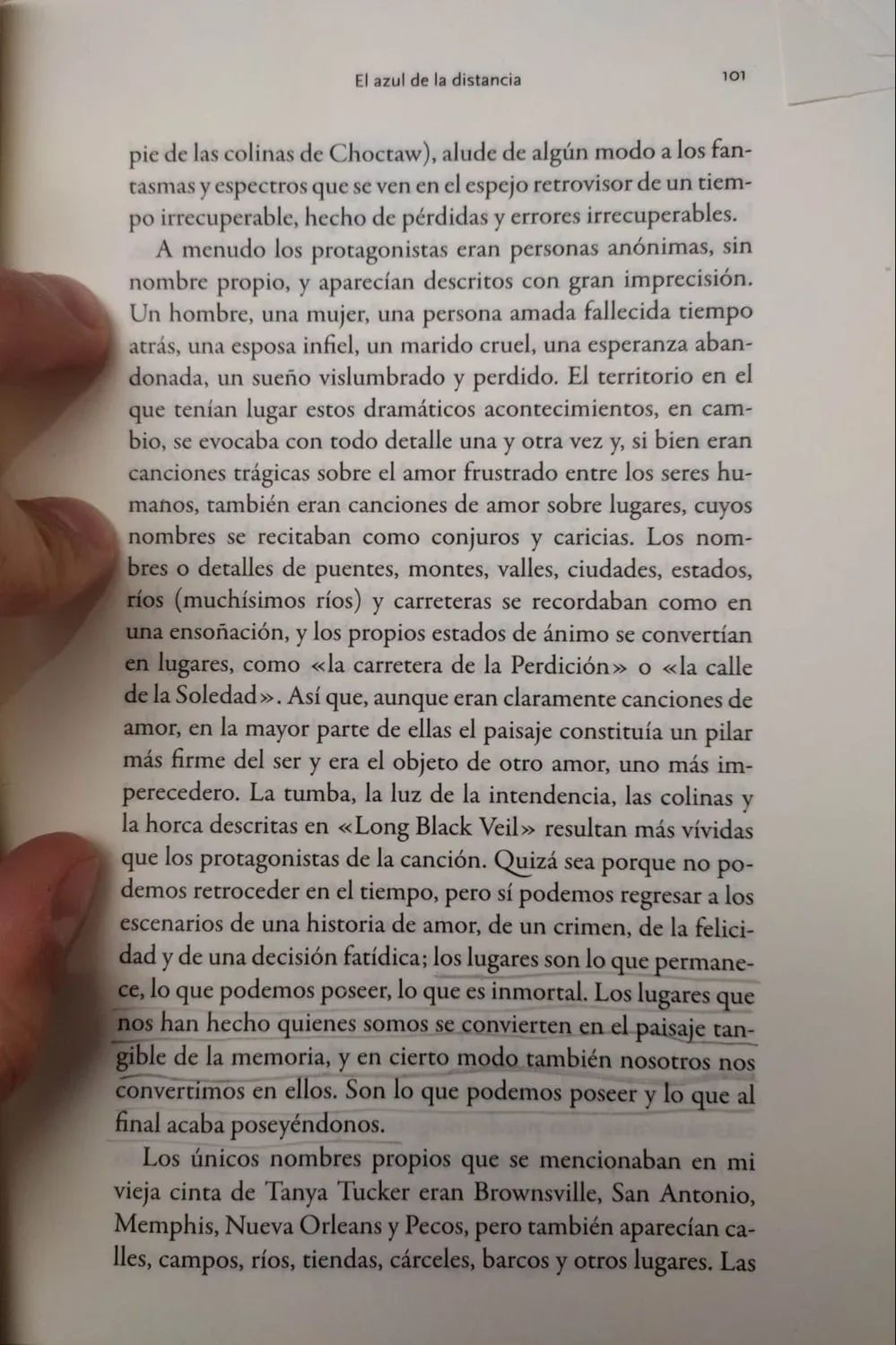 Me encanta Una guía sobre el arte de perderse. De verdad. Entiendo que su lectura me cambió. Y si no se agotara a cada rato en las librerías lo regalaría siempre y a todos. Dejo por acá un extracto donde habla del peso de los lugares. La foto incluye mis dedos.