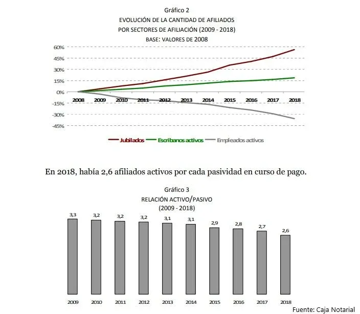 La Caja Notarial cubre a los escribanos públicos y a sus empleados. Al cierre de 2018 tenía 7.668 afiliados activos que financiaban algo más de 2.200 jubilaciones. La relación entre activos y pasivos era de 2,6 y se prevé un deterioro progresivo. La relación proyectada para 2050 es de 2,5 activos.