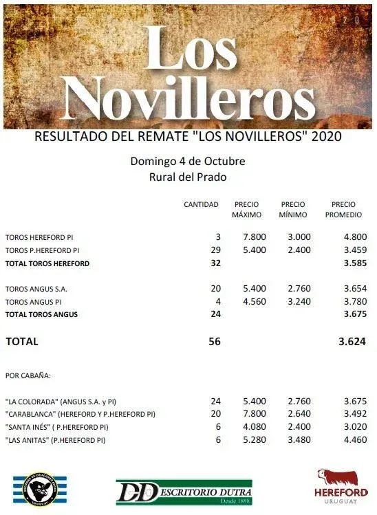 El Escritorio Dutra dispersó genética de las razas Aberdeen Angus y Hereford de las cabañas Carablanca, La Colorada, Santa Inés y Las Anitas, en el remate "Los Novilleros", que se realizó el domingo 4 en la Rural del Prado, logrando un promedio por los toros Angus y por los Hereford superior a los US$ 3.500.