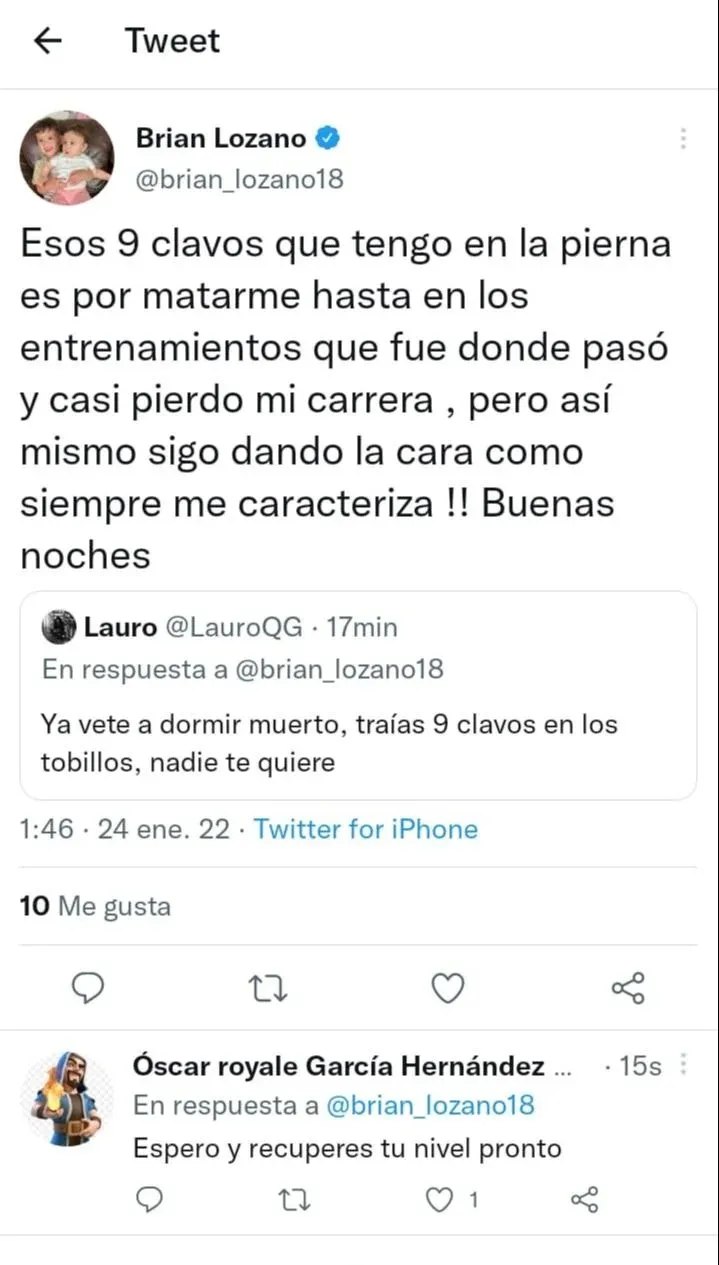 Lozano no se contuvo y le comentó: “Esos 9 clavos que tengo en la pierna es por matarme hasta en los entrenamientos que fue donde pasó y casi pierdo mi carrera, pero así mismo sigo dando la cara como me caracteriza! Buenas noches”.