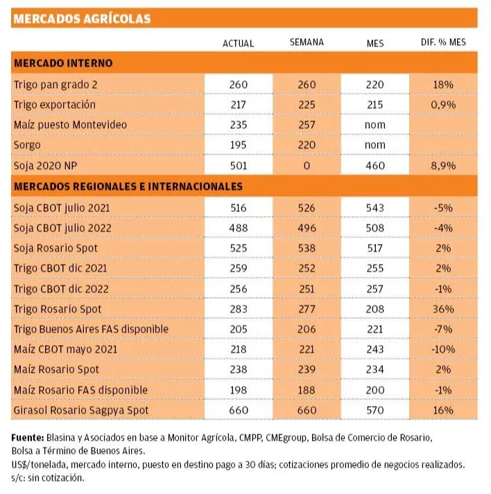 Eso sigue alentando a la cebada en Uruguay, que se rige por los precios del trigo en Chicago y que supera ya los US$ 250 por tonelada en forma consolidada.
