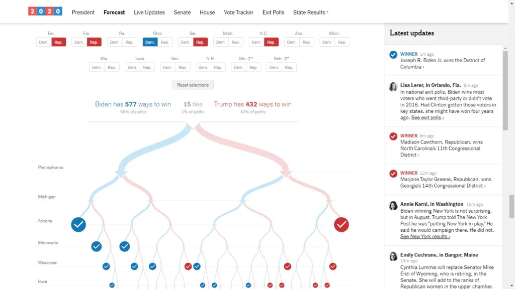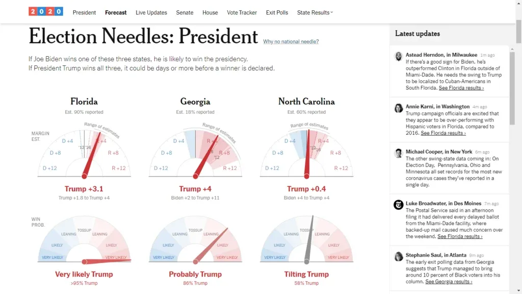 1:51. New York Times corrige su proyección: Georgia y Carolina del Norte no están tan definidos. El voto por correo cambia todo en esta elección, y no se sabe cuántos votos aún siguen en el correo sin ser entregados. Además, Trump reclama que esos votos no se cuenten si llegan después de fecha.