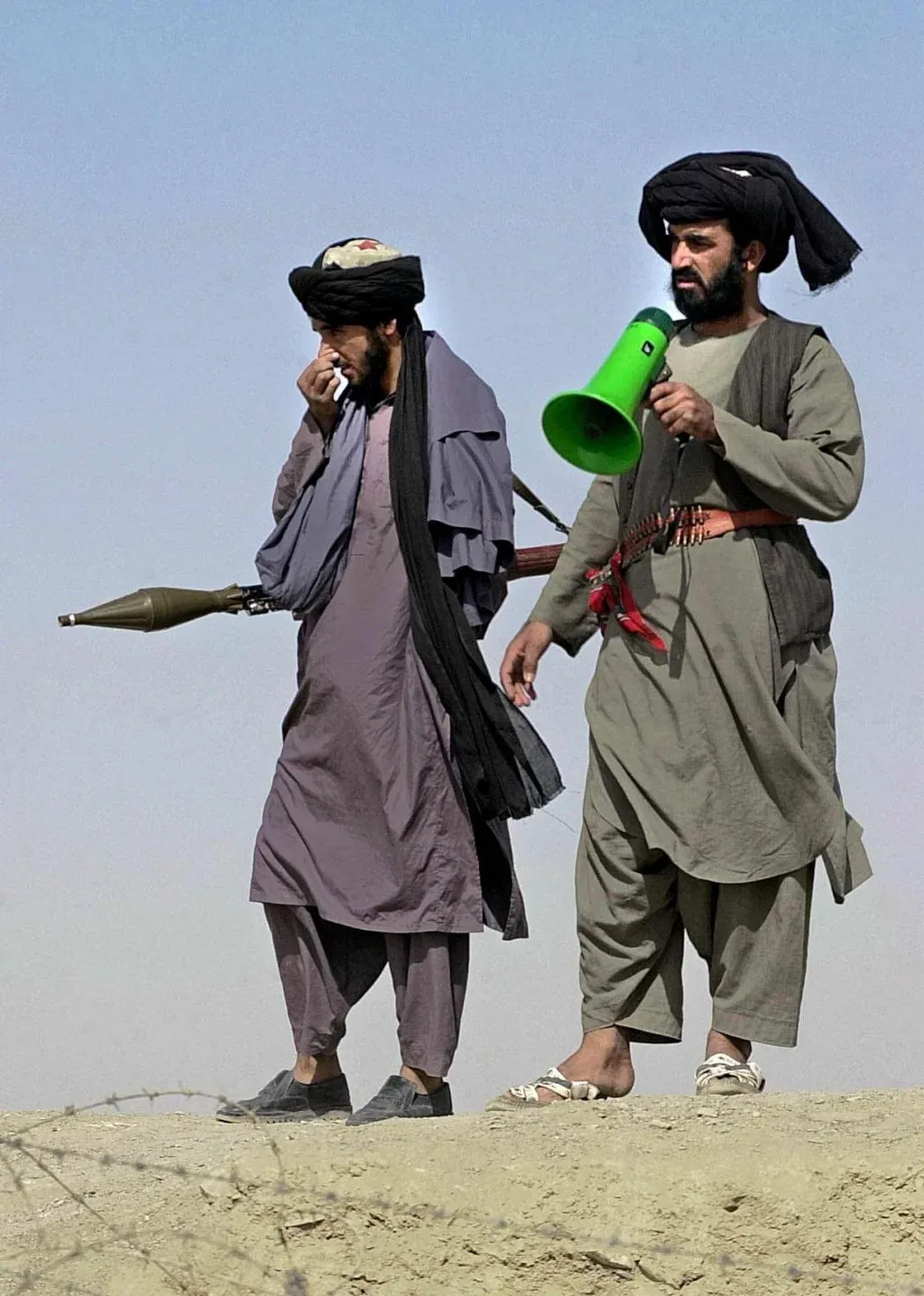 Miliciano talibanes, uno con un megáfono y otro con un lanzacohetes