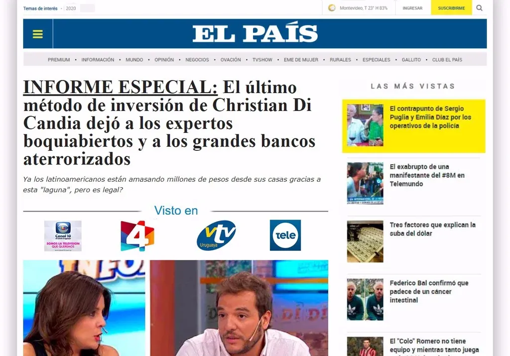 Al hacer clic en el supuesto artículo, el usuario es derivado a una página que simula ser la de El País de Montevideo, algo que antes se aplicaba con El Mundo de Madrid. La novedad es que se trata de un medio local, con la misma tipografía, estética e incluso haciendo referencia a otras notas que sí fueron publicadas en el medio, como El contrapunto de Sergio Puglia y Emilia Díaz por los operativos de la policía, o El exabrupto de una manifestante del #8M en Telemundo. A través de una historia inventada, se busca que el usuario ingrese una cantidad de dinero en una cuenta bancaria o introduzca sus datos bancarios en un formulario e invierta su dinero en criptomonedas.