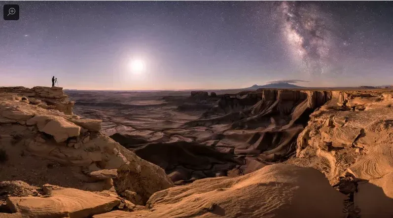 El desierto de Utah junto a la galaxia de Andrómeda, la Luna y la Vía Láctea.