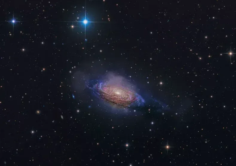 La galaxia espiral NGC 3521 se encuentra a unos 26 millones de años luz de distancia, en la constelación de Leo. Esta imagen comprende aproximadamente 20,5 horas de tiempo de exposición, recolectando datos en varios tipos de filtros.