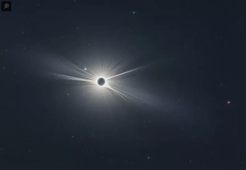 La imagen muestra la corona solar en todo su esplendor durante el eclipse total de sol de agosto. En el lado izquierdo aparece la estrella azul Regulus y a la derecha se ve a Marte.