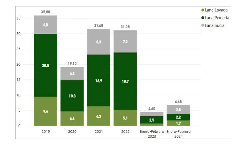 Uruguay exportó 6.678.277 kilos de lana en enero y febrero de 2024, un volumen 52% superior al de los dos primeros meses de 2023.