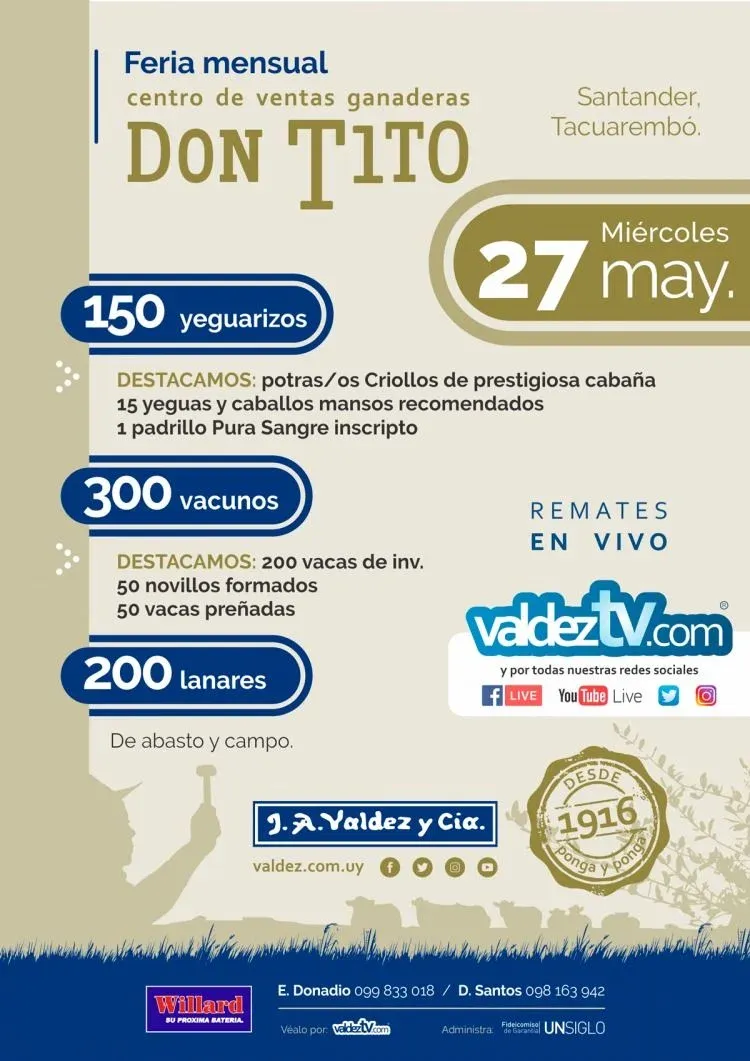 Valdez y Cía anunció para este miércoles 27 de mayo su feria mensual en el Centro de Ventas Ganaderas Don Tito.