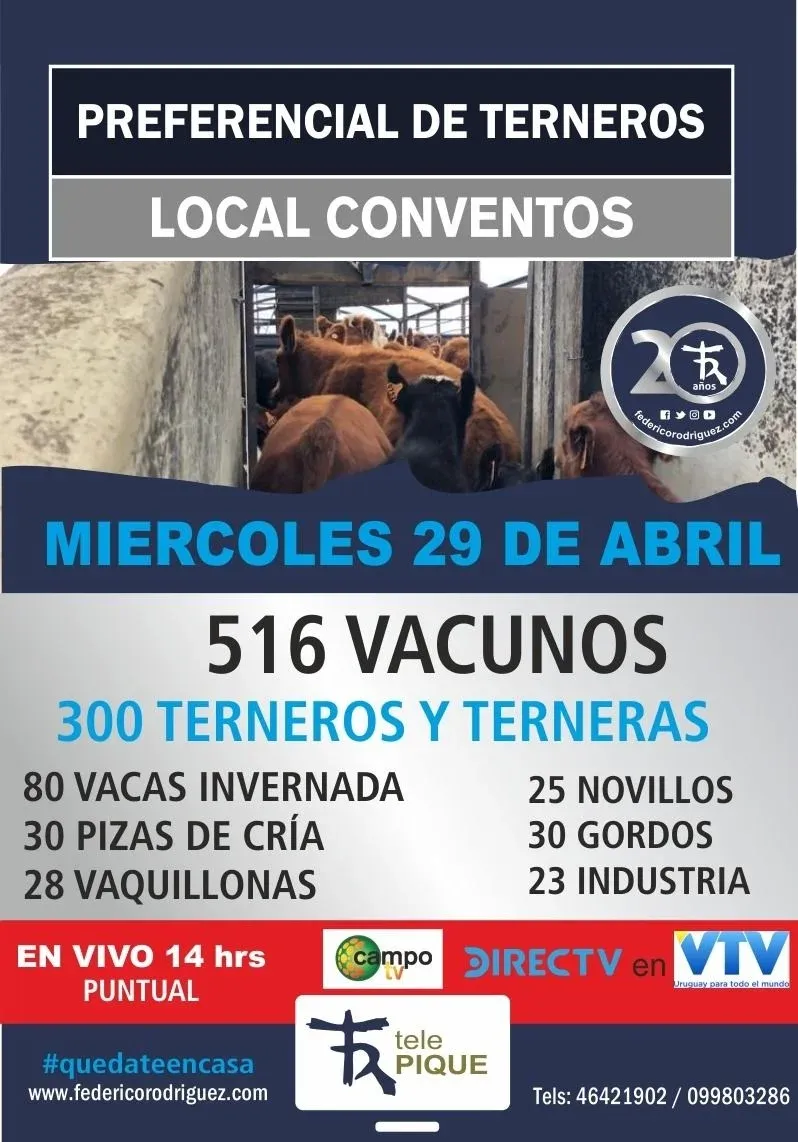 Otro de los clásicos remates ferias que organiza la firma Federico Rodríguez Negocios Rurales se hará este miércoles, 29 de abril, cuando se concrete el denominado preferencial de terneros.