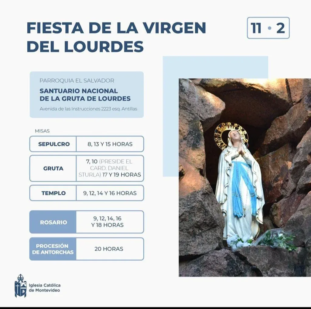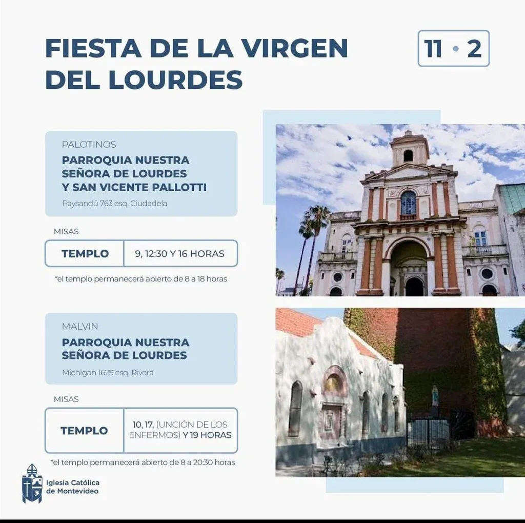Habrá misas a las horas 9, 12:30 y 16 en la Parroquia Nuestra Señora de Lourdes y San Vicente Pallotti (Paysandú 763, esquina Ciudadela); a la hora 10, 17 y 19 en la Parroquia Nuestra Señora de Lourdes en Malvín (Michigan 1629 esquina Av. Rivera); y habrá misas y otras actividades durante toda la jornada en el Santuario Nacional de la Gruta de Lourdes (Av. de las Instrucciones 2223 esquina Antillas), con una misa a la hora 10 que presidirá el cardenal Daniel Sturla.
