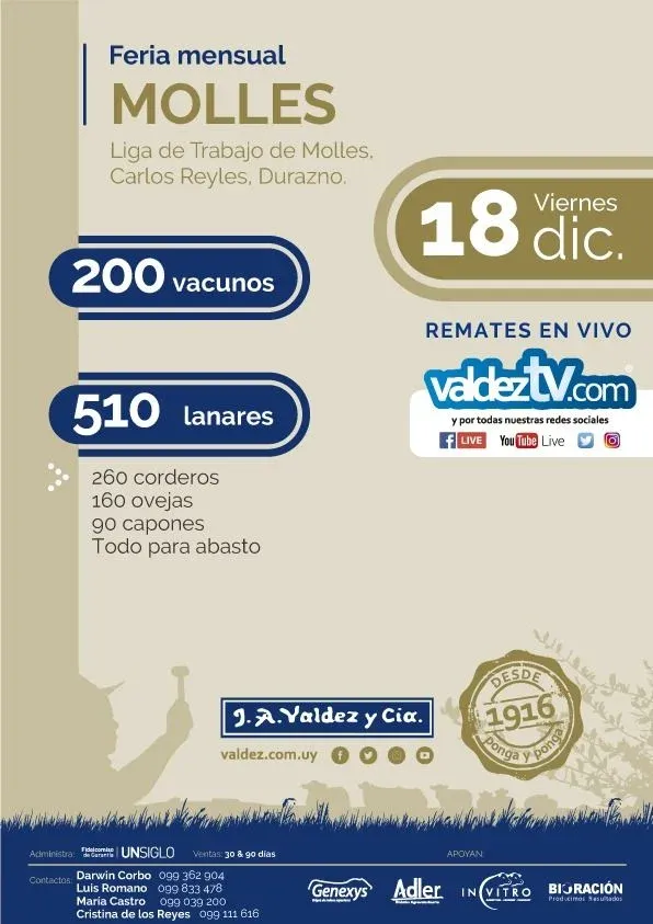 En esta oportunidad el escritorio pondrá a consideración vacunos y lanares en el local de la Liga de Trabajo de Molles, en Carlos Reyles.