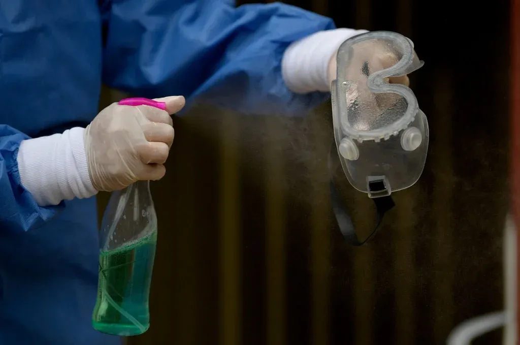 Un trabajador de la salud deinfecta sus lentes después de tomar una muestra de covid-19 en Bogotá, Colombia