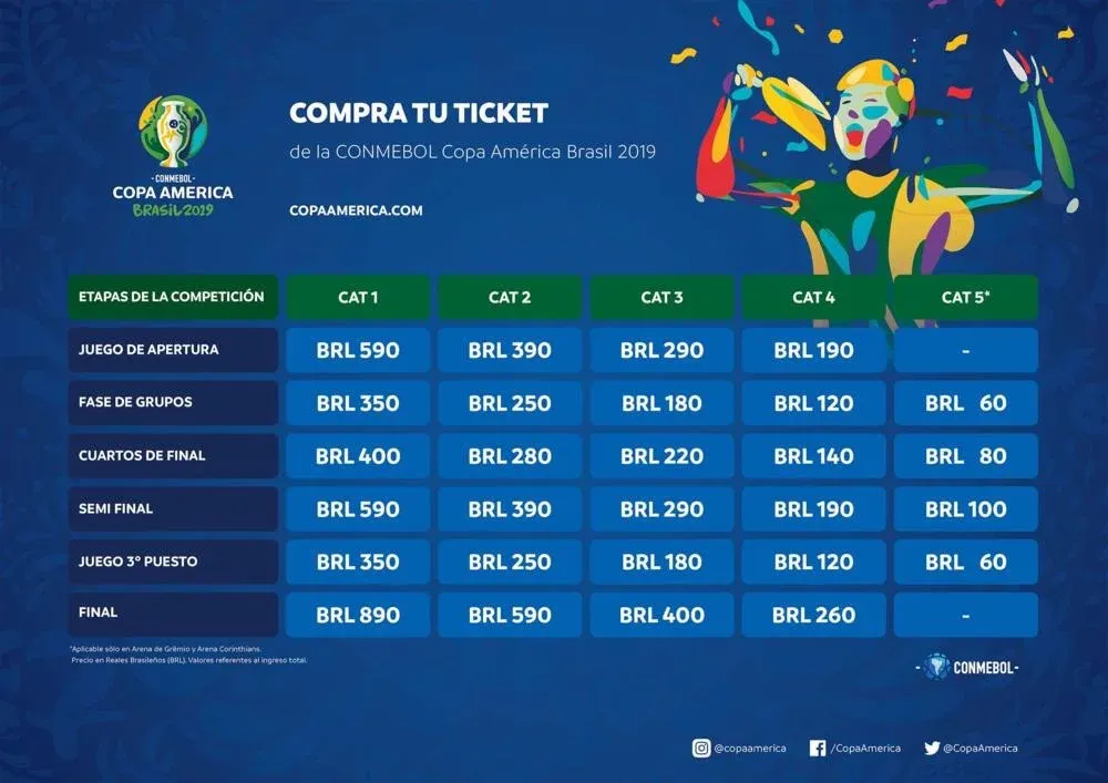 Pero lo que muchos hinchas quieren saber es cómo y cuánto saldrán las entradas para poder ver a Uruguay en esta Copa América. Las entradas se dividen por fase de competición (fase de grupos, cuartos de final, semifinal y final) y en cuatro y hasta cinco categorías dependiendo del estadio. La categoría 1 son los asientos que se encuentran a los costados, la categoría 2 son las que se encuentran en los "codos" del estadio, las ultimas dos o tres categorías se encuentran detrás de los arcos.