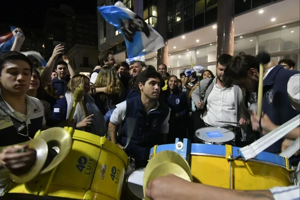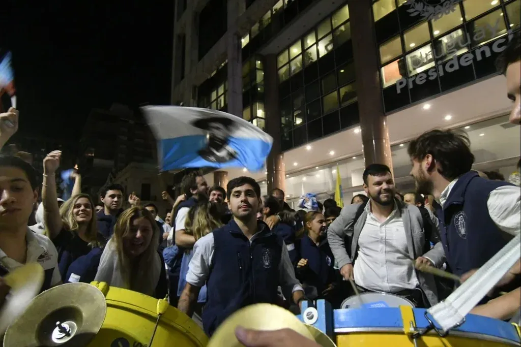 A la salida de Torre Ejecutiva, las banderas flameaban y los bocinazos se mezclaban con los cánticos y gritos que repetían “soy celeste, soy celeste” y "presidente, presidente" una y otra vez. Algunos saltaban sobre el capó de los autos mientras decenas de papeletas del No y otras tantas del balotaje de 2019 con el rostro de Lacalle Pou y Argimón volaban por los aires a modo de celebración.