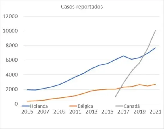 Y si el “eutanasiable” está entre quienes, por su lugar de residencia y sus recursos económicos, puede acceder a cuidados paliativos, la ley de eutanasia también le estará generando o profundizando el sufrimiento y dándole un salvavida de plomo con el supuesto “derecho” a la eutanasia. La devaluación de su vida por la ley, como vimos, es previa a toda decisión: a él sí se lo debe matar si lo pide. ¿No tiene ya suficiente carga con su patología o condición de salud? ¿No merece toda la valoración por su dignidad y toda la ayuda por su especial necesidad? ¿Y le diremos que es una carga inútil? ¿Le diremos que es lógico que tenga un sufrimiento insoportable? Pregunten a un paliativista si el paciente necesita la valoración de su entorno, que vea que no es una carga, que confíe en que podrá superar el sufrimiento y vivir el final de su vida en paz…, y vean si la sociedad, por medio de la ley, no les dice exactamente lo contrario. Y, encima, esa devaluación de su vida, ese mandato social, a los médicos, de matarlo, se le presentará hipócritamente como un “derecho”: como algo que él merece (¿merecer que se lo considere sin valor, descartable, eliminable?; ¿tener “derecho” a que violen su primer derecho, el derecho a la vida?). Con ello, “se paraliza la mano del paliativista” (como dijo la Dra. Guedes), se impide que quienes pueden aliviarlo lo ayuden. Actualmente, el 95% de los que manifiestan el deseo de adelantar la muerte, cuando reciben cuidados paliativos revierten su decisión, superan el sufrimiento existencial y mueren en paz y sin dolor, después de haber logrado muchísimo en el fin de sus vidas. Y el 5% restante, igualmente muere sin sufrimiento, con sedación paliativa, y en forma natural. Esto se perderá con la legalización de la eutanasia: en vez de superar el sufrimiento, cada vez más gente morirá con sufrimiento insoportable, pensando que su vida no vale, que es una carga inútil para los demás. Así pasó en todos los países con eutanasia, aunque ofrezcan también cuidados paliativos cada vez mejores: en Bélgica (ley de 2002), en Holanda (empezaron a autorizar eutanasias judicialmente antes de la ley de 2002) y en Canadá (Ley en 2016). Ver la gráfica.