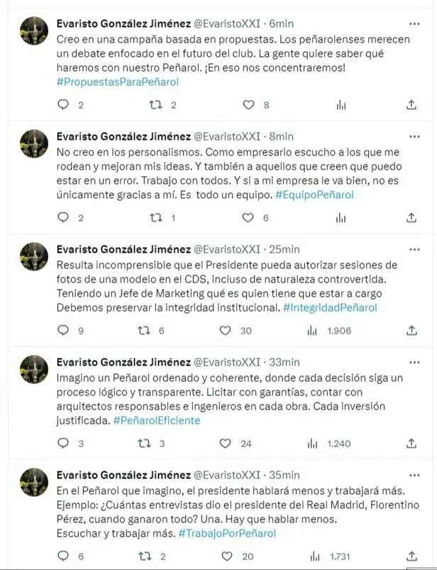 Los tuits que subió este martes Evaristo González criticando la gestión del presidente de Peñarol