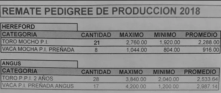 En la tarde del martes 16 en el local Santa Bernardina, de la Sociedad Rural de Durazno, se alcanzó un promedio general de US$ 2.533,64 por los 28 Angus vendidos (US$ 3.840 fue el máximo) y de US$ 2.288 por los 21 toros Hereford comercializados (con US$ 2.760 de valor máximo).
