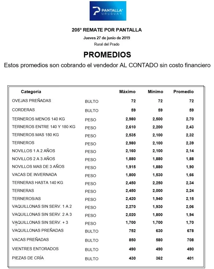 La comercialización, que fue la N° 205 de Pantalla Uruguay, se concretó el jueves 27 como es clásico desde la Rural del Prado y con una oferta original de 8.000 vacunos. La financiación estuvo a cargo del banco Itaú y, según comentaron operadores del consorcio, hubo una destacada participación de inversores operando en el local o a distancia, en ese caso siguiendo los lotes por TV Cable, Internet y los canales 661 y 1661 de DirecTV.