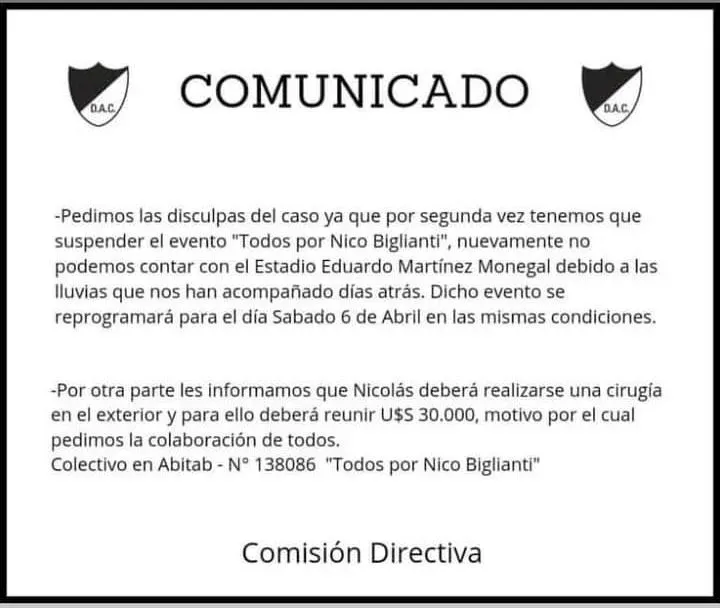 Al mismo tiempo se realizará el sábado 6 de abril en el estadio Martínez Monegal de Canelones un evento llamado "Todos por Nico Biglianti" que tiene como finalidad recaudar fondos para el ahora entrenador.