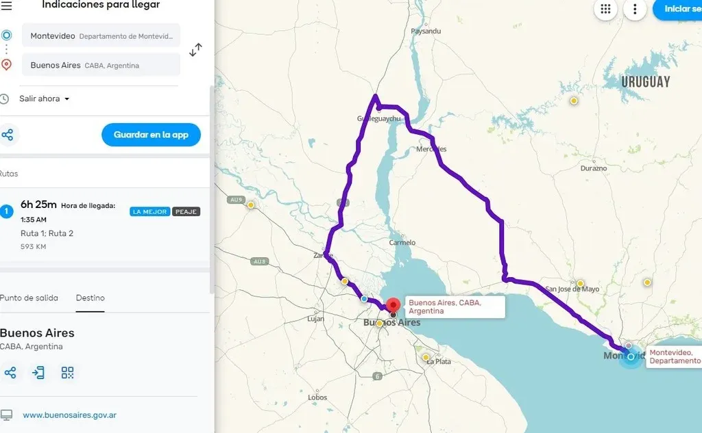 La ruta que sugiere Waze para cruzar a Argentina desde Montevideo