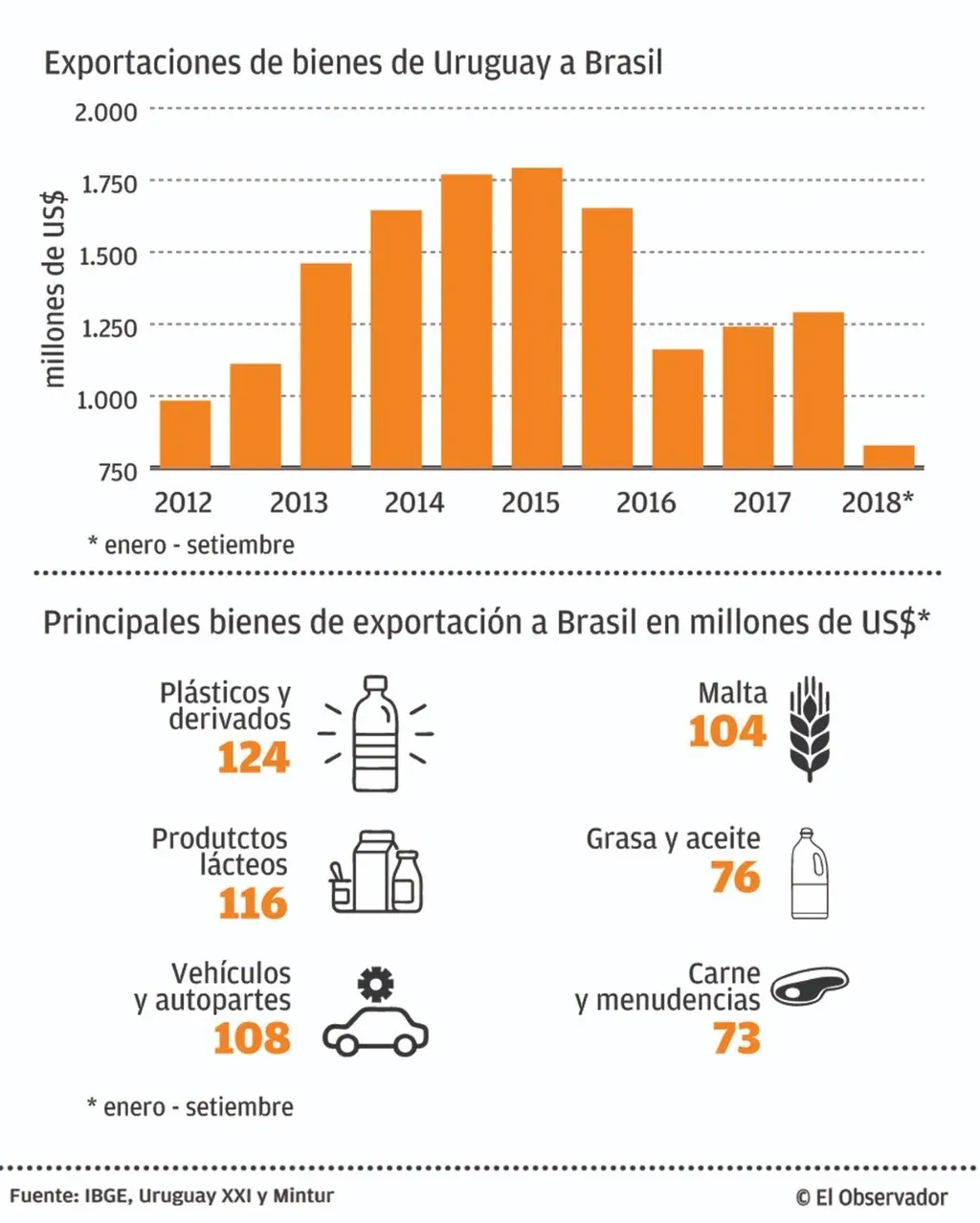 En el acumulado entre enero y octubre de este año, las exportaciones de bienes hacia Brasil sumaron US$ 1.022 millones con una caída de 8,7% respecto al mismo período de 2017, según datos aduaneros. De todas formas, el país vecino sigue en el podio de los compradores productos uruguayos y solamente es superado por China.