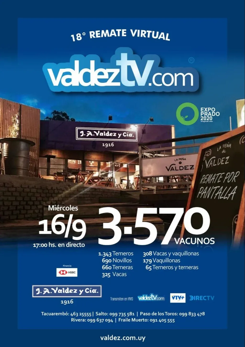 El escritorio Valdez y Cía tiene todo listo para realizar el esperado 18° remate virtual de ValdezTV, con una edición especial, que se hará en vivo desde el stand de la firma en la Expo Prado 2020, instancia comercial que se podrá ver a través de valdeztv.com, VTV+ o DirecTV. La transmición comenzará a la hora 17 con una oferta que se puede acercar a los 4.000 vacunos, más 600 lanares.