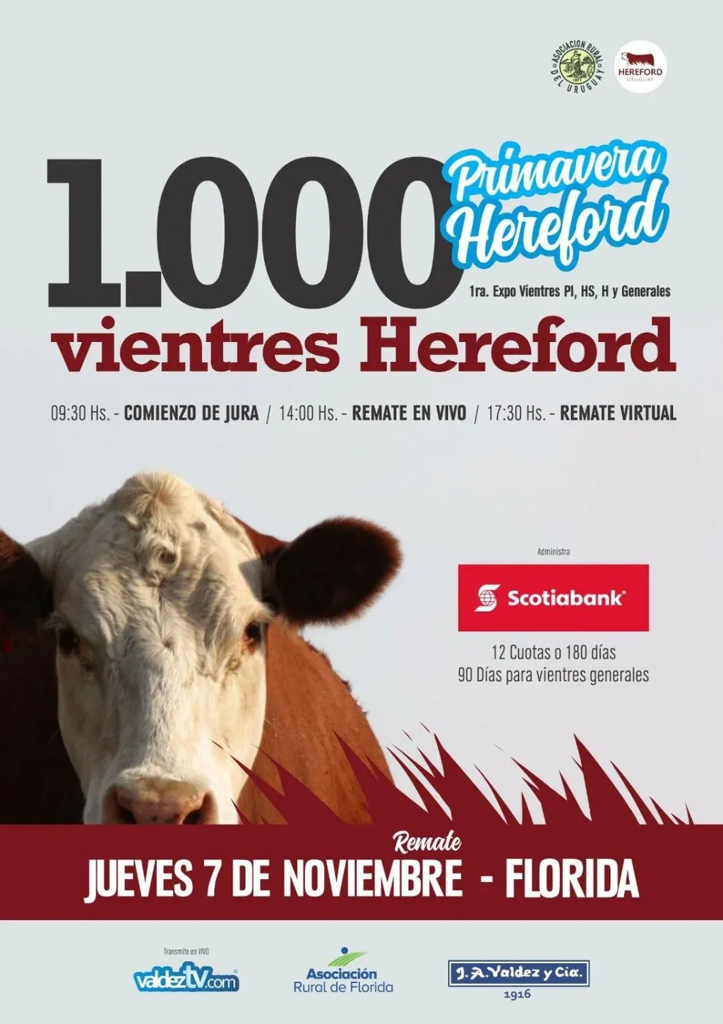 El jueves 7 de noviembre en la Asociación Rural de Florida (ARF) Valdez y Cía hará el remate Primavera Hereford, en lo que será la 1ª Expo Vientres Hereford.