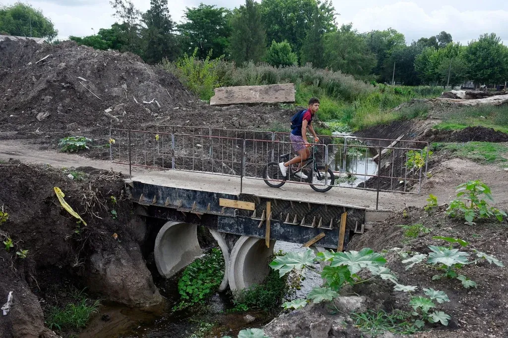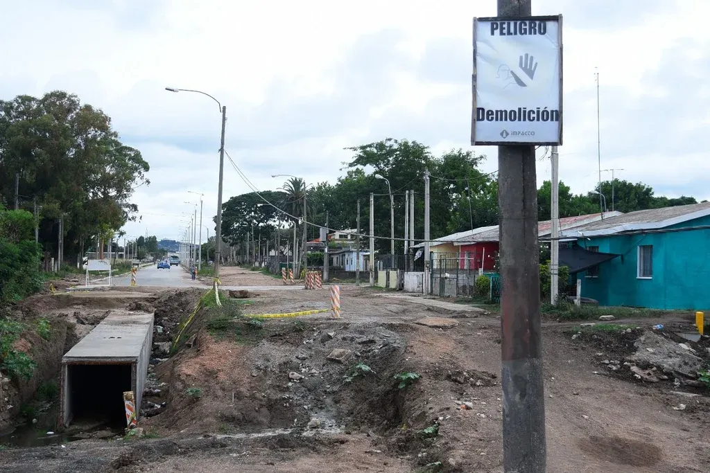 El martes 11 las obras estaban en pausa por la licencia de la construcción, que retomó la actividad el miércoles. Mientras tanto, un cartel colgado en una columna que se alza del medio del barro advierte por el peligro de demolición. Los vecinos pueden pasar a pie, en bicicleta, en moto o a caballo por el puente, pero aún no hay lugar para los autos.