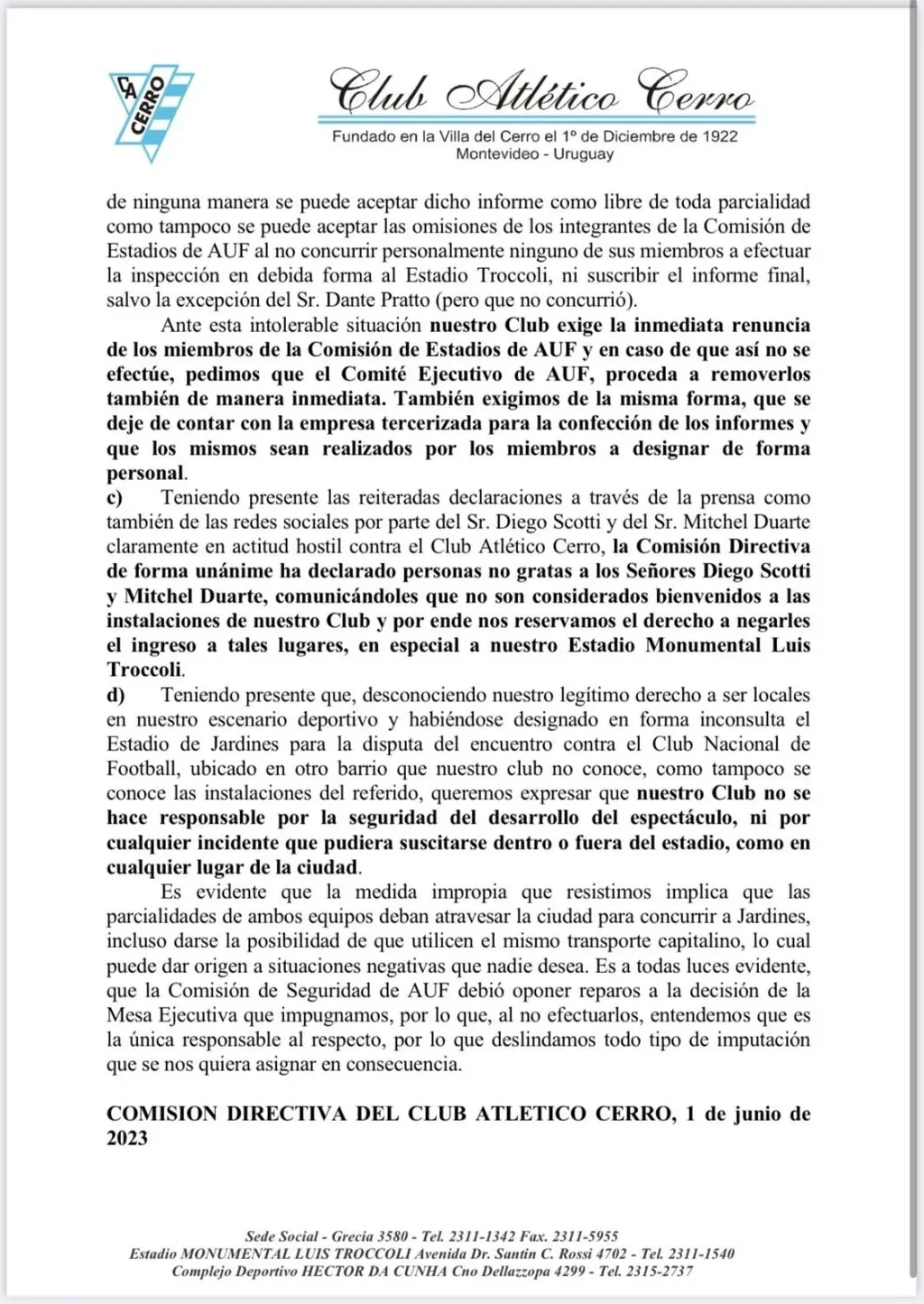 Por todo eso, Cerro "exige la inmediata renuncia de los miembros de la Comisión de Estadios de la AUF y en caso de que así no se efectúe, pedimos que el Comité Ejecutivo de AUF proceda a removerlos también de manera inmediata".