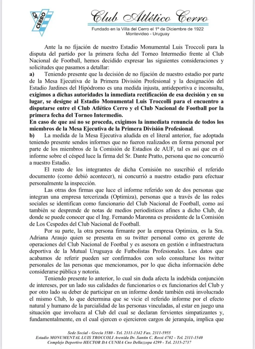 La comisión directiva de Cerro entiende que la decisión de la Mesa Ejecutiva de la Asociación Uruguaya de Fútbol (AUF) de no fijar el Tróccoli y designar Jardines del Hipódromo para el encuentro de este sábado contra Nacional, "es una medida injusta, antideportiva e inconsulta", por ese motivo exige "la inmediata rectificación de esa decisión y en su lugar, se designe al Estadio Monumental Luis Tróccoli".