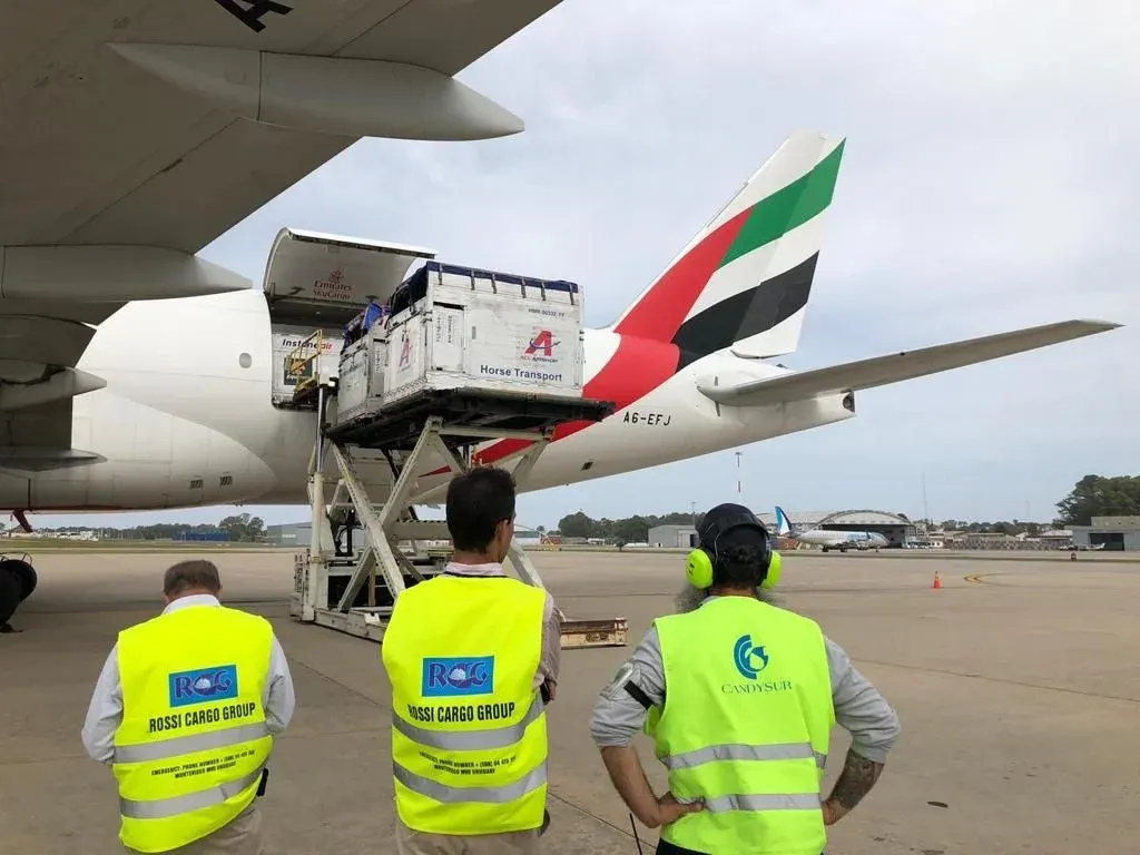 Un reciente envío aéreo de 75 caballos deportivos, desde Carrasco a Dubai –Emiratos Árabes Unidos–, significó un récord sudamericano, destacó Gustavo Rossi, director de la empresa Rossi Cargo Group, responsable de la logística; la mayor cantidad enviada en avión desde Uruguay fue cuando esa compañía vehiculizó la exportación de 48 caballos de polo, hace 15 años.