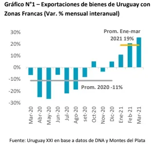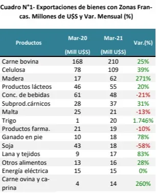 En el primer trimestre de 2021, las exportaciones de bienes totalizaron US$ 2.172 millones, lo que implica un aumento de 19,3% respecto a lo exportado en el igual período del año pasado, previo al impacto más agudo por la pandemia, que comenzó a pegar con dureza desde fines de marzo hasta entrada la primavera de 2020. Carne bovina, madera y trigo fueron los productos con mayor contribución a esta suba durante enero-marzo.