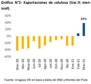 En tanto, la celulosa fue el segundo producto de exportación en el mes, registrando ventas por US$ 109 millones. Esto representa un 39% más que en marzo de 2020, lo que implica el crecimiento mensual más importante del último año. Como se observa en el siguiente gráfico, la celulosa no registraba aumentos desde principios de 2020 y en febrero de este año revirtió la tendencia. En el acumulado enero-marzo las ventas externas de celulosa se situaron en US$ 286 millones, lo que implica una suba de 3% respecto al primer trimestre de 2020, destacó Uruguay XXI.