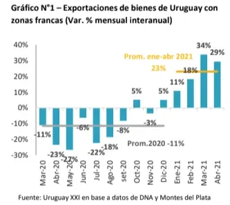 En abril de 2021 las solicitudes de exportación -incluyendo zonas francas- se ubicaron en US$ 883 millones, pautando un incremento de 29,4% en términos interanuales. Además, fue el total mensual más elevado desde junio de 2017, cuando las ventas al exterior totalizaron US$ 1.083 millones.